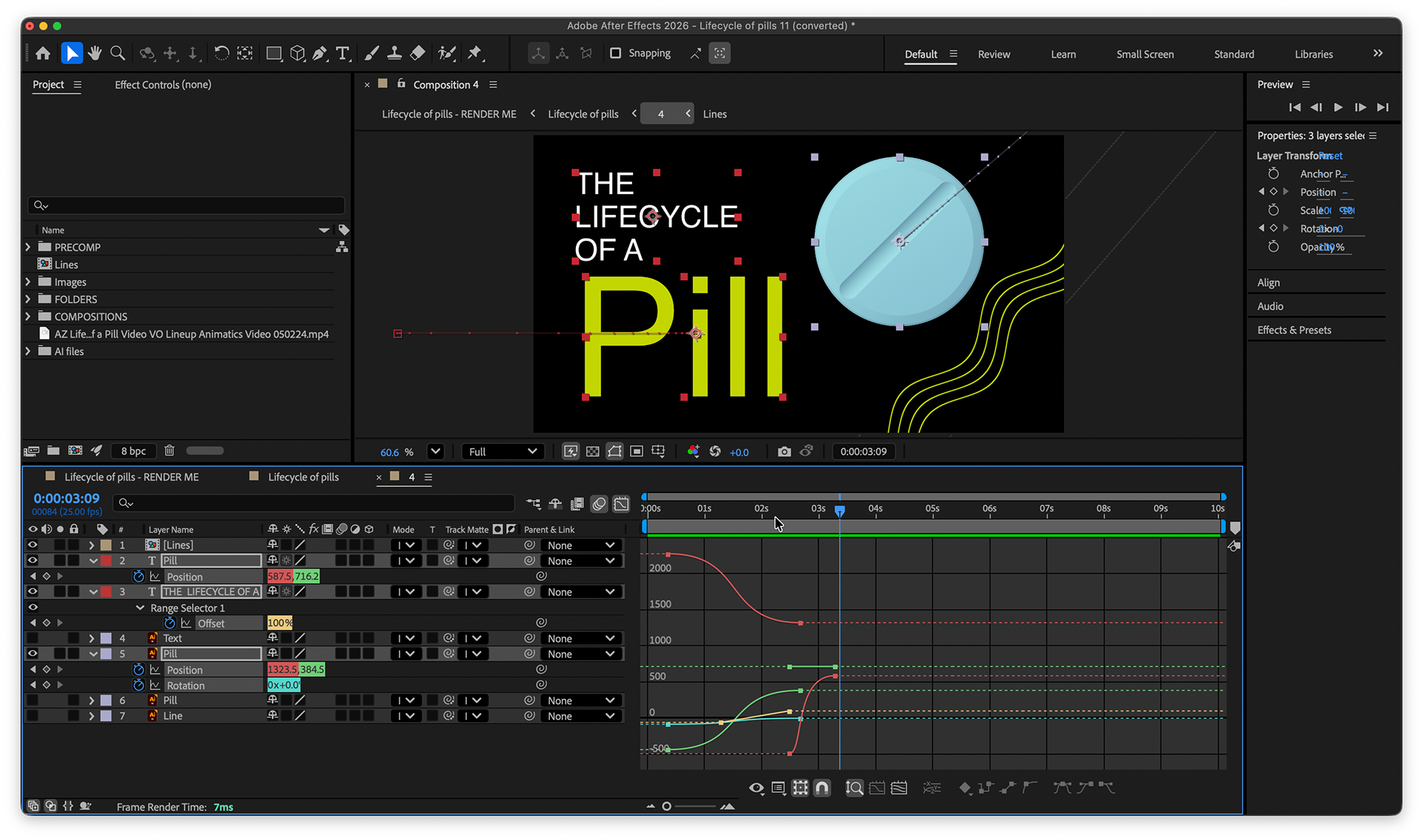 Implemented clean keyframe structuring and graph editor refinement for smooth character motion and typography transitions.